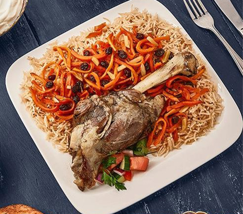 Fragrant basmati rice cooked in lamb broth layered with tender lamb, sweet carrots, and plump raisins—finished with a touch of warm spices for the perfect sweet-savory harmony.
