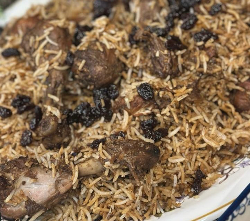 Aromatic chicken and rice cooked with special spices, topped with sweet black raisins and served with tangy crushed pickle—a soulful blend of flavor in every bite.
