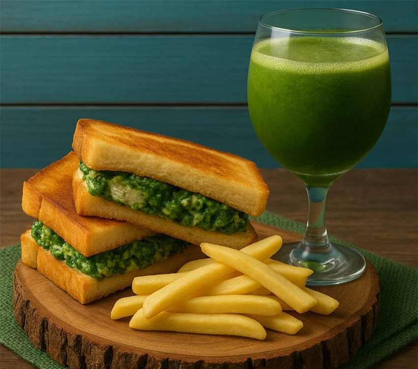 Tender chicken mixed with creamy spinach, layered in toasted bread—served with crispy fries for a hearty, flavor-packed meal.