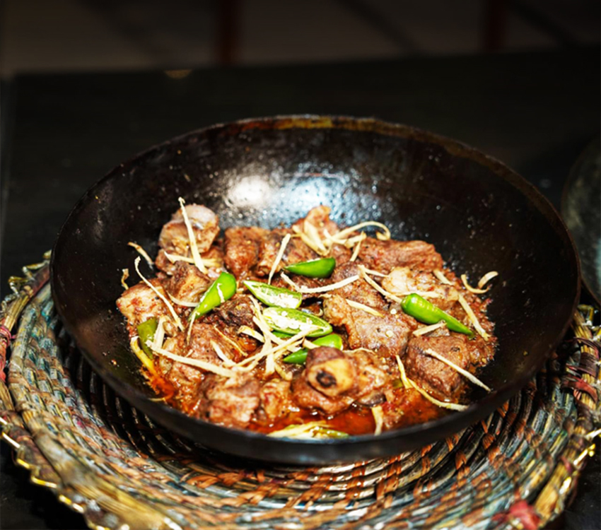 A rich, gingery lamb karahi with bold, salty notes and a hint of smokiness—low on spice, high on deep, umami flavor. A true taste of Peshawar’s culinary soul.