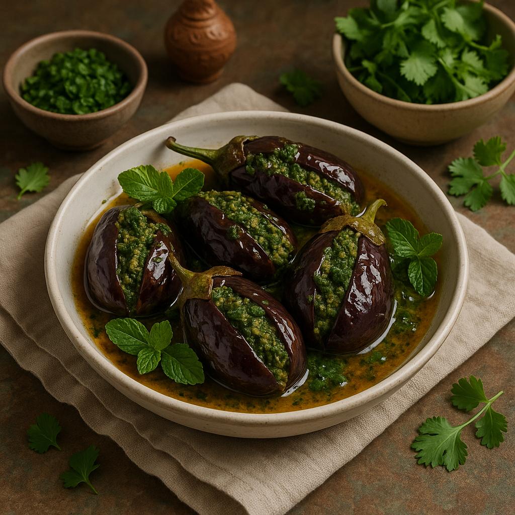 “Tender baby eggplants stuffed with a rich, spiced masala blend and slow-cooked in a creamy, aromatic gravy. A perfect vegetarian dish that’s full of flavour, texture, and soul!”.