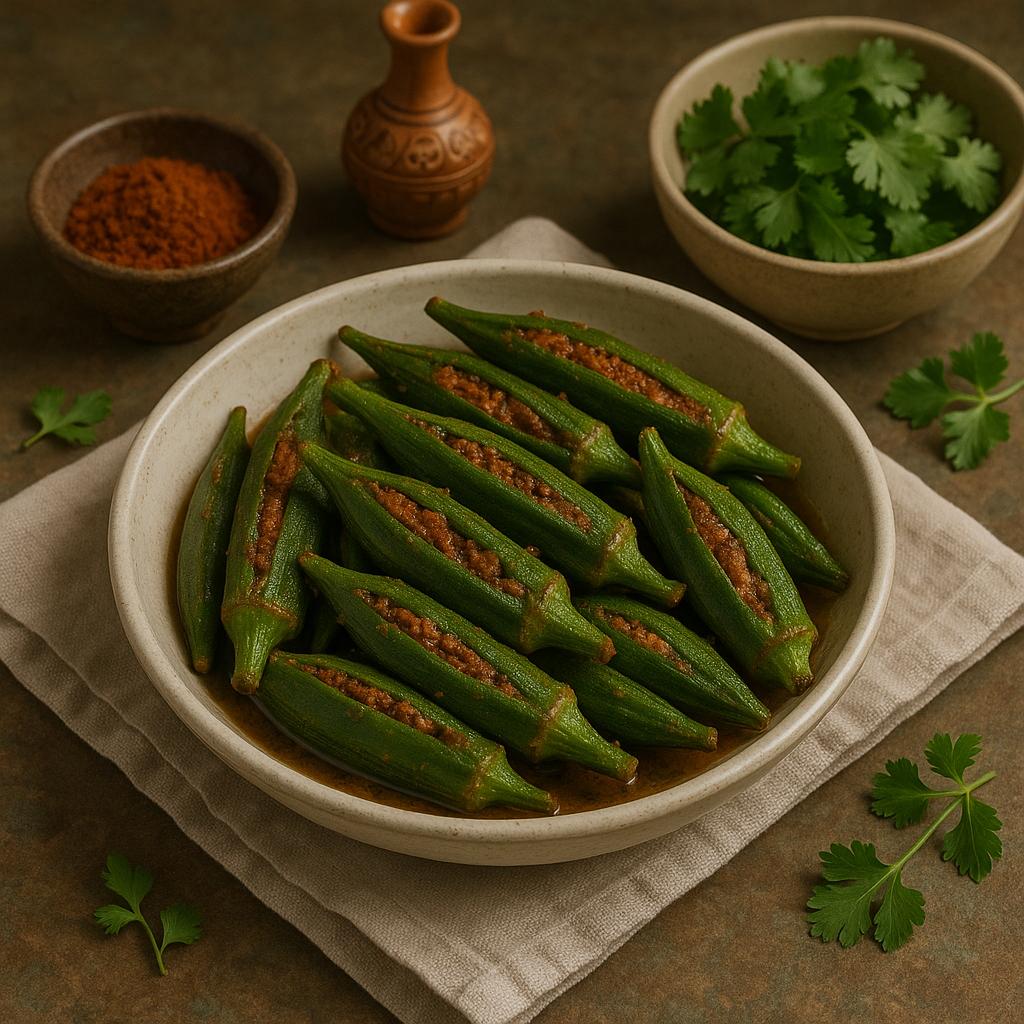 “Fresh okra stuffed with a tangy, spicy Achari masala, pan-cooked to perfection for that perfect balance of crunch and bold desi flavour. “A must-have for pickle lovers!”
